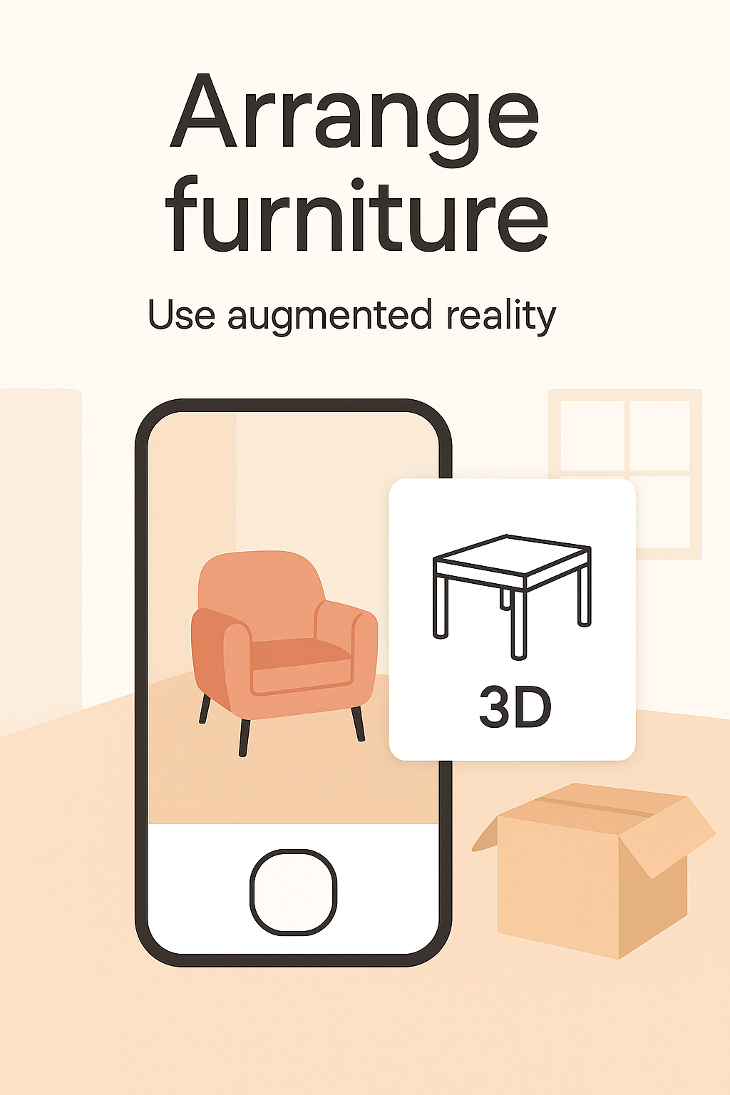 Illustrative graphic showcasing augmented reality for furniture arrangement, featuring a smartphone displaying a virtual chair and table, ideal for interior design applications.