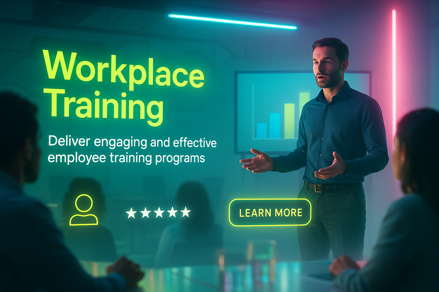 Dynamic promotional graphic for workplace training programs featuring a speaker, vibrant colors, and modern design elements. Ideal for corporate training marketing.
