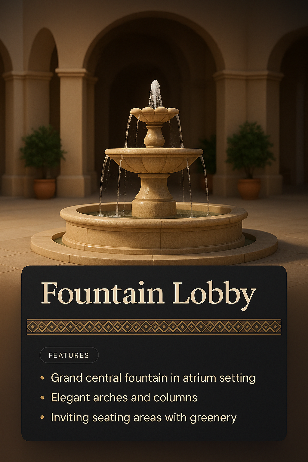 /Collection: /by davooda/Type: PNG/A beautifully designed fountain lobby featuring a grand central fountain surrounded by elegant arches and columns. The inviting seating areas are complemented by greenery, creating a serene atmosphere.
