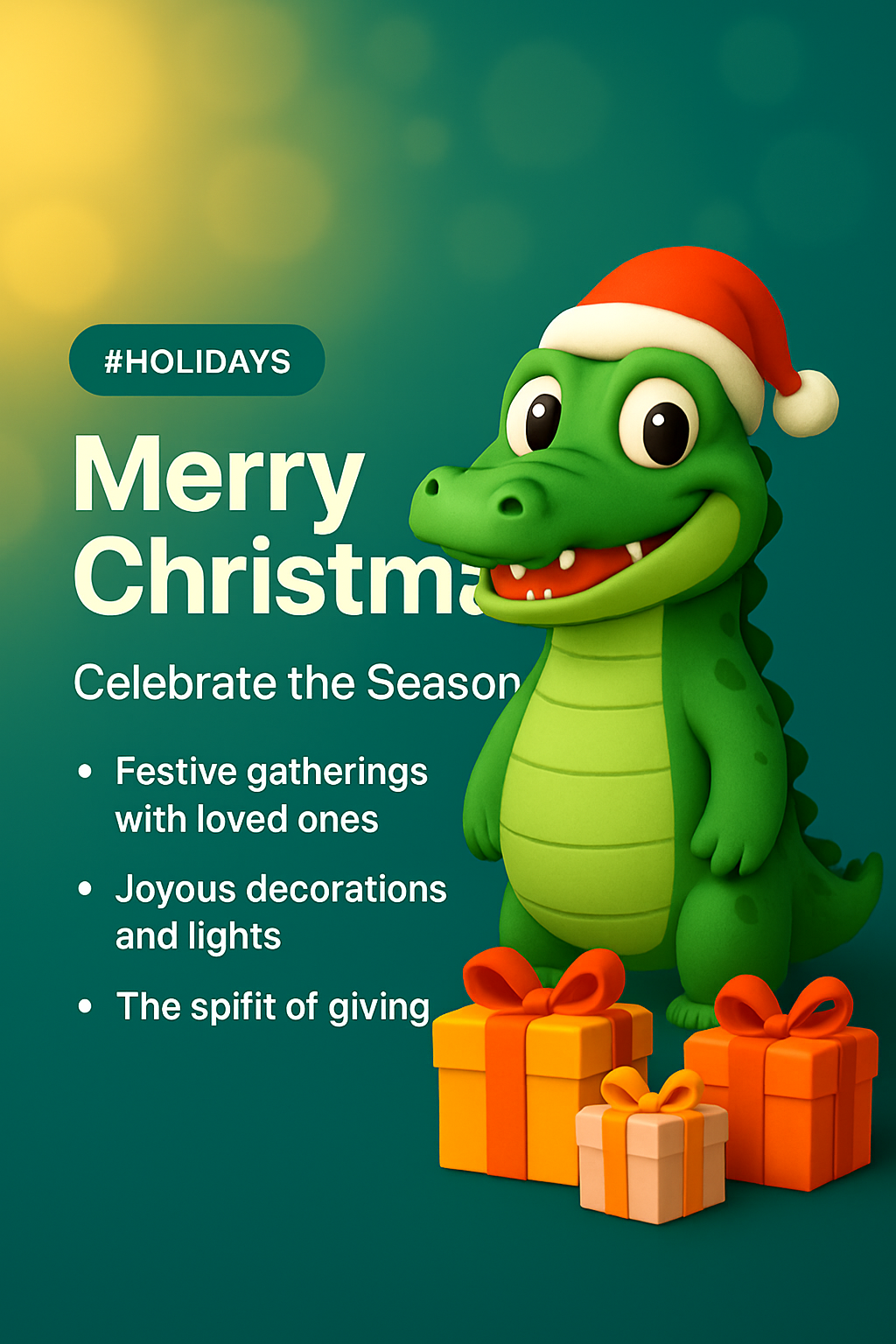 Colorful holiday greeting card featuring a cartoon alligator in a Santa hat, surrounded by gift boxes. Ideal for seasonal promotions and festive communication.