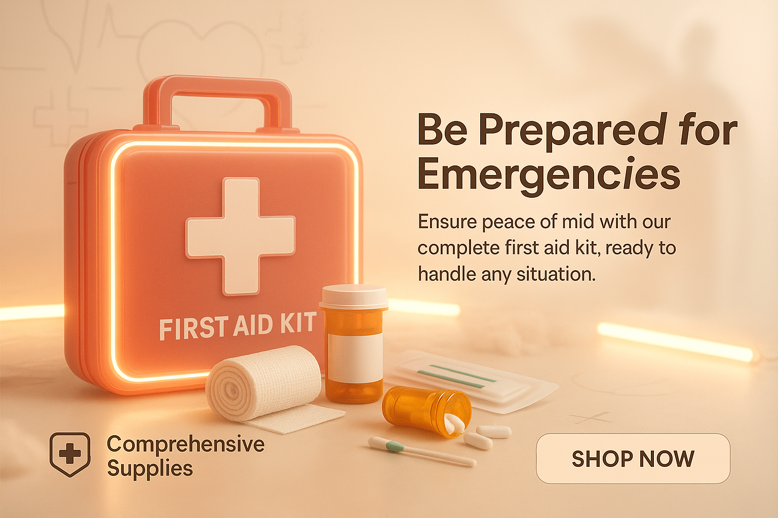 Engaging promotional graphic showcasing a first aid kit, emphasizing readiness for emergencies. Ideal for healthcare or safety supply marketing.