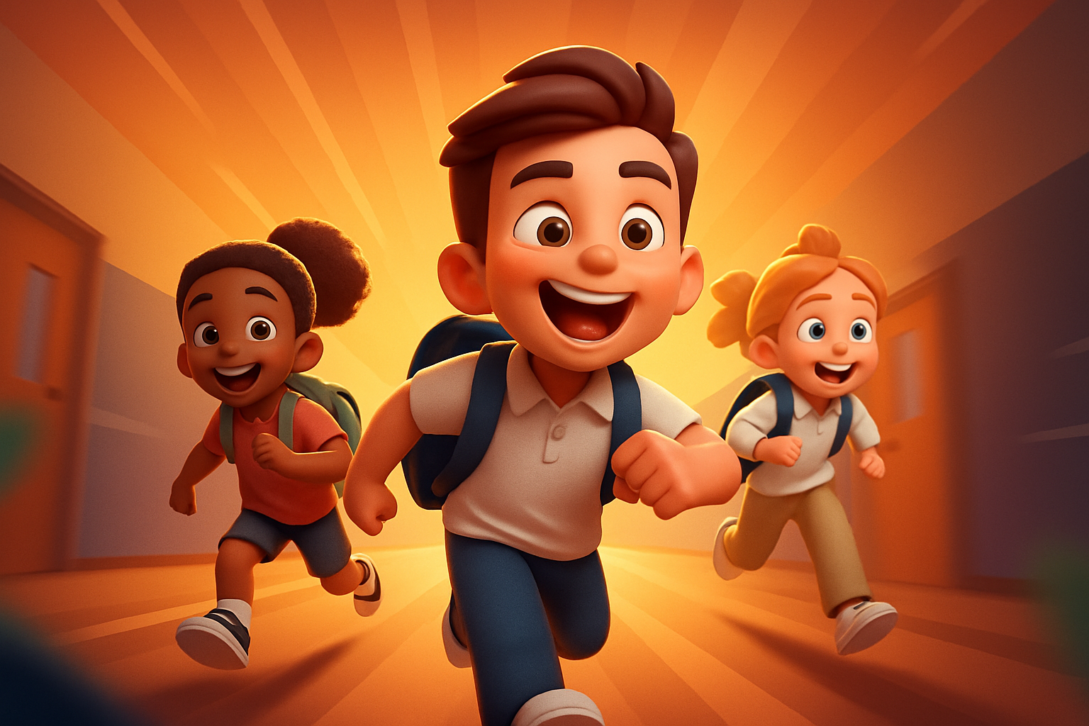 Three animated children with backpacks joyfully run through a school corridor, showcasing a vibrant and dynamic atmosphere. The background features warm colors radiating energy.