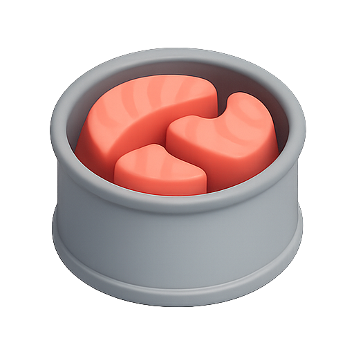A modern 3D illustration of a pet food bowl containing salmon-shaped kibble, showcasing a clean and minimalistic design ideal for pet-related branding.