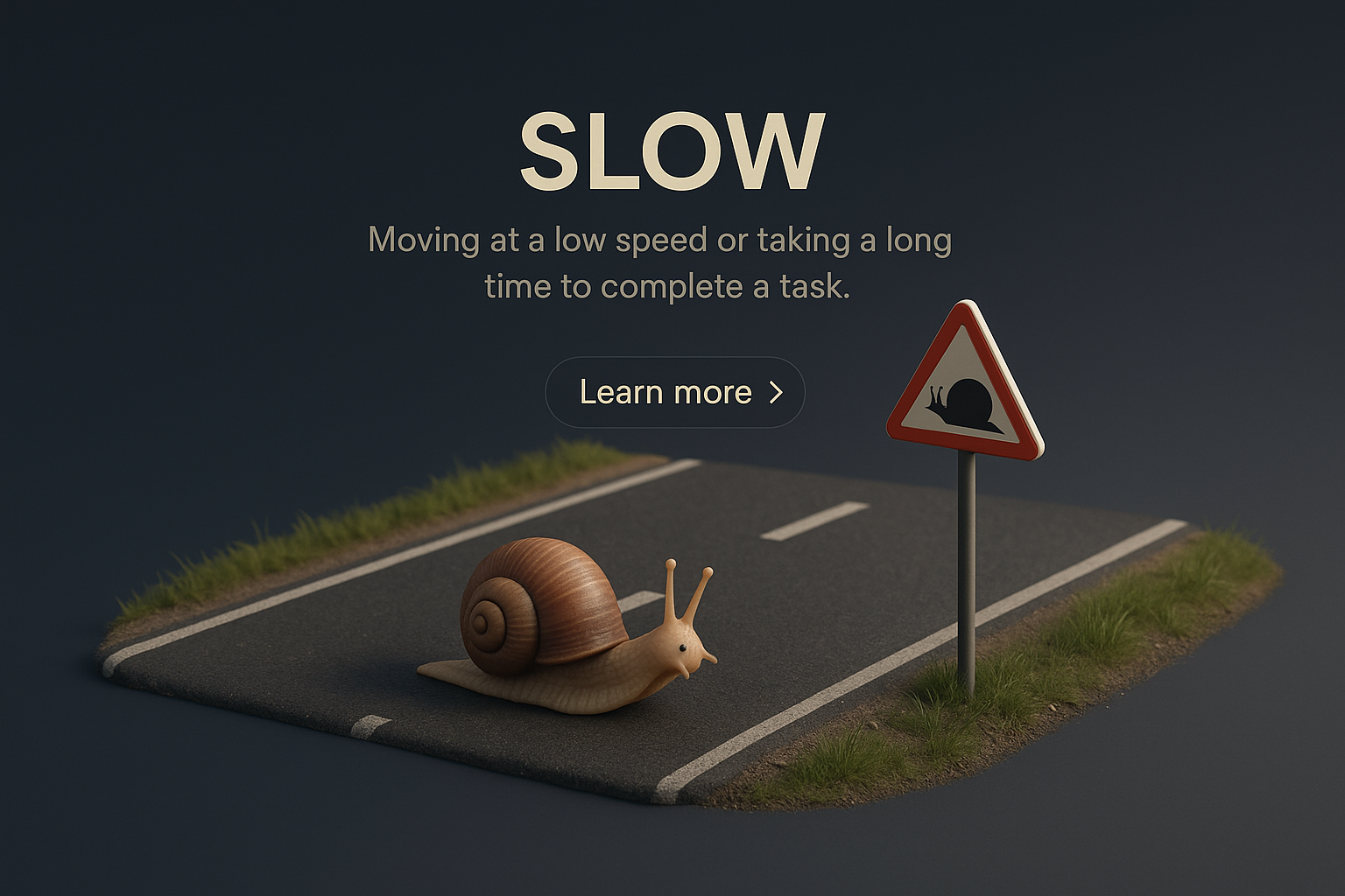 A zoomed-out 3D depiction of a snail slowly crossing a road, with a caution sign and grass. The dark gradient background enhances the vivid colors of the scene.