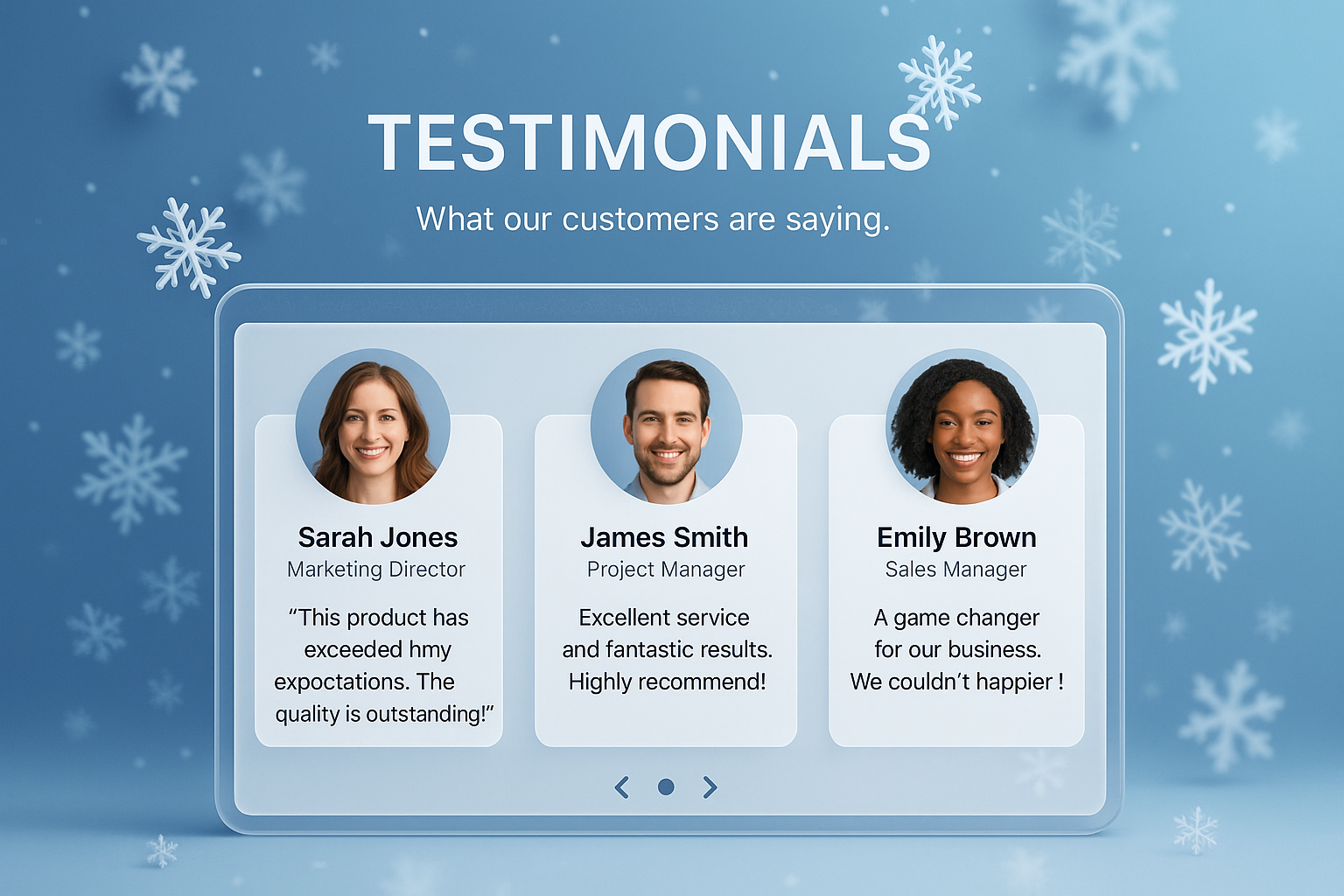 /Collection: /by davooda/Type: PNG/A visually appealing testimonials section featuring three testimonial cards. Each card includes a circular author photo, name, position, and quote set against a snowflake-themed background.