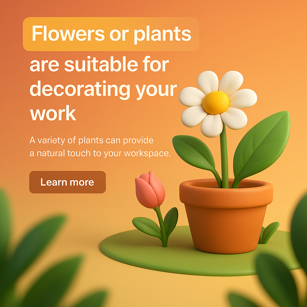 A vibrant 3D illustration featuring potted flowers designed to promote workspace decoration. Ideal for marketing materials related to home and office aesthetics.