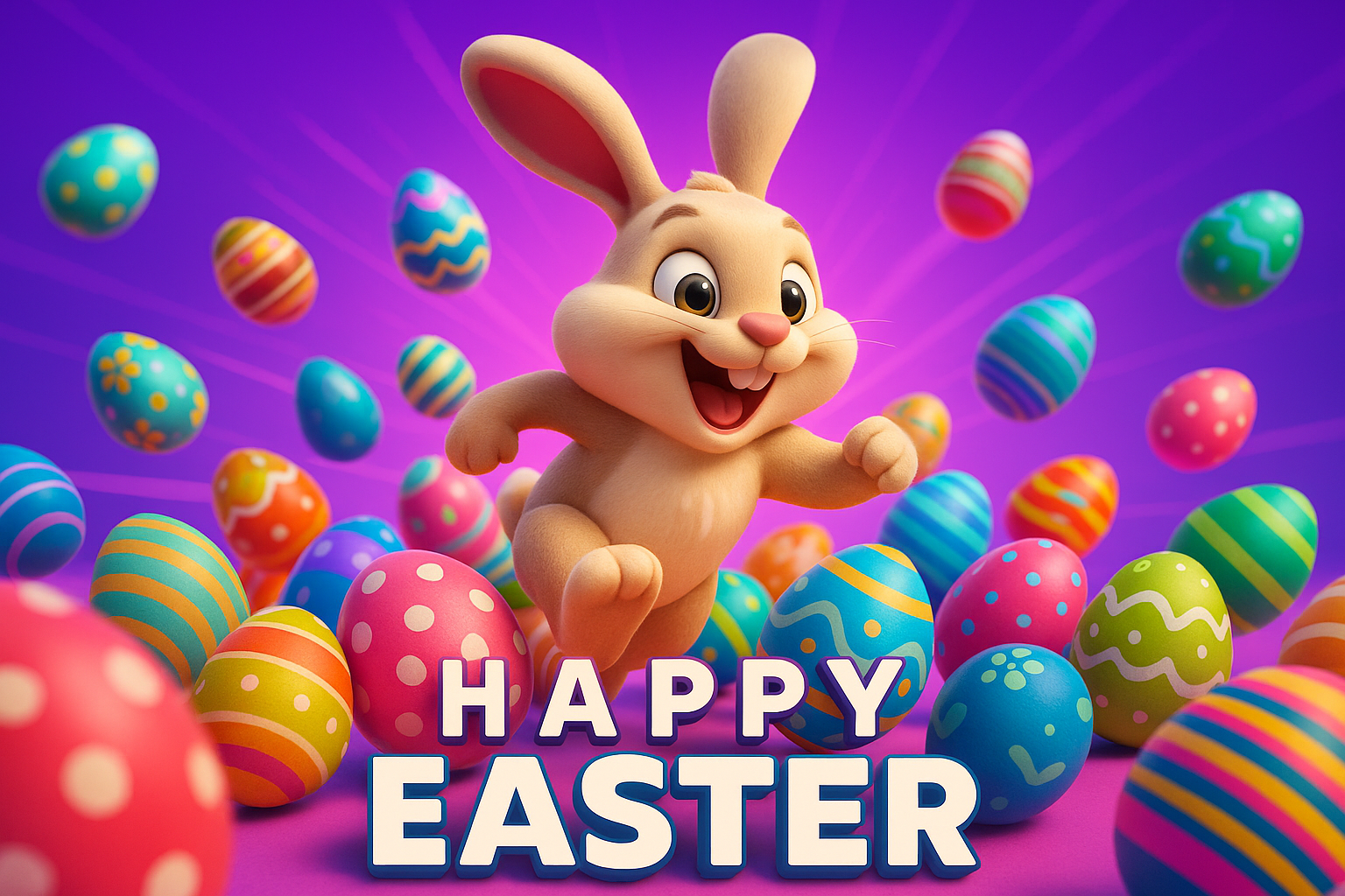 Colorful Easter Celebration Graphic with Bunny and Eggs