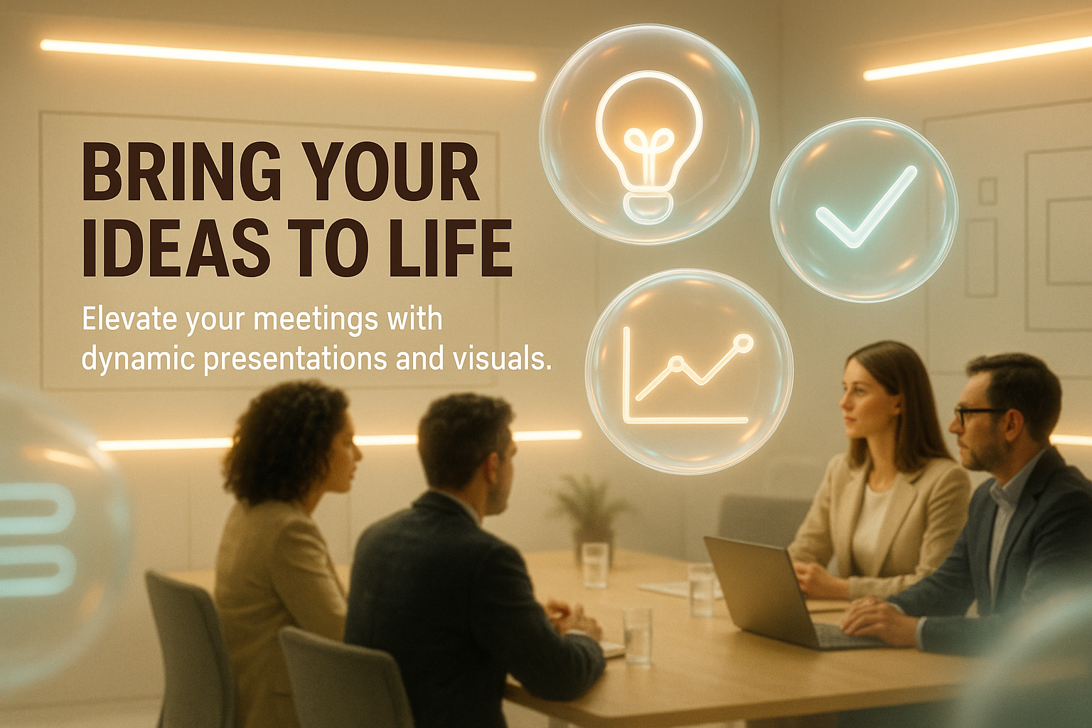 A professional setting depicting a team in a meeting, enhanced by dynamic graphics. Ideal for corporate presentations and marketing materials.