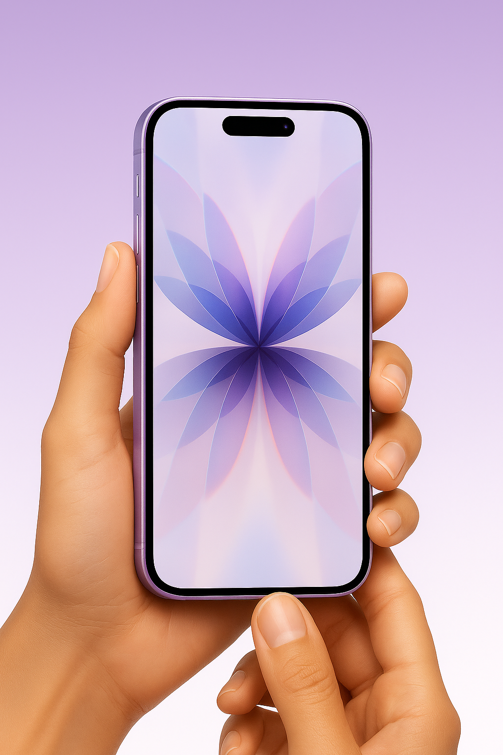 A person holding a purple smartphone featuring a creative floral design on its screen. The gradient background enhances the vibrant colors of the device.