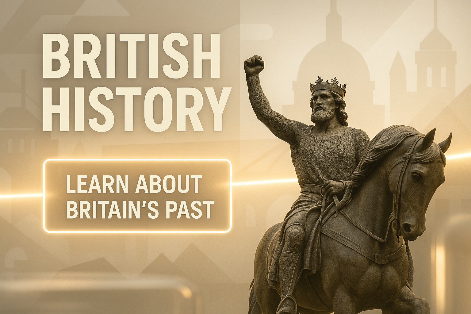Engaging promotional graphic highlighting British history with a statue and modern design elements, ideal for educational campaigns.
