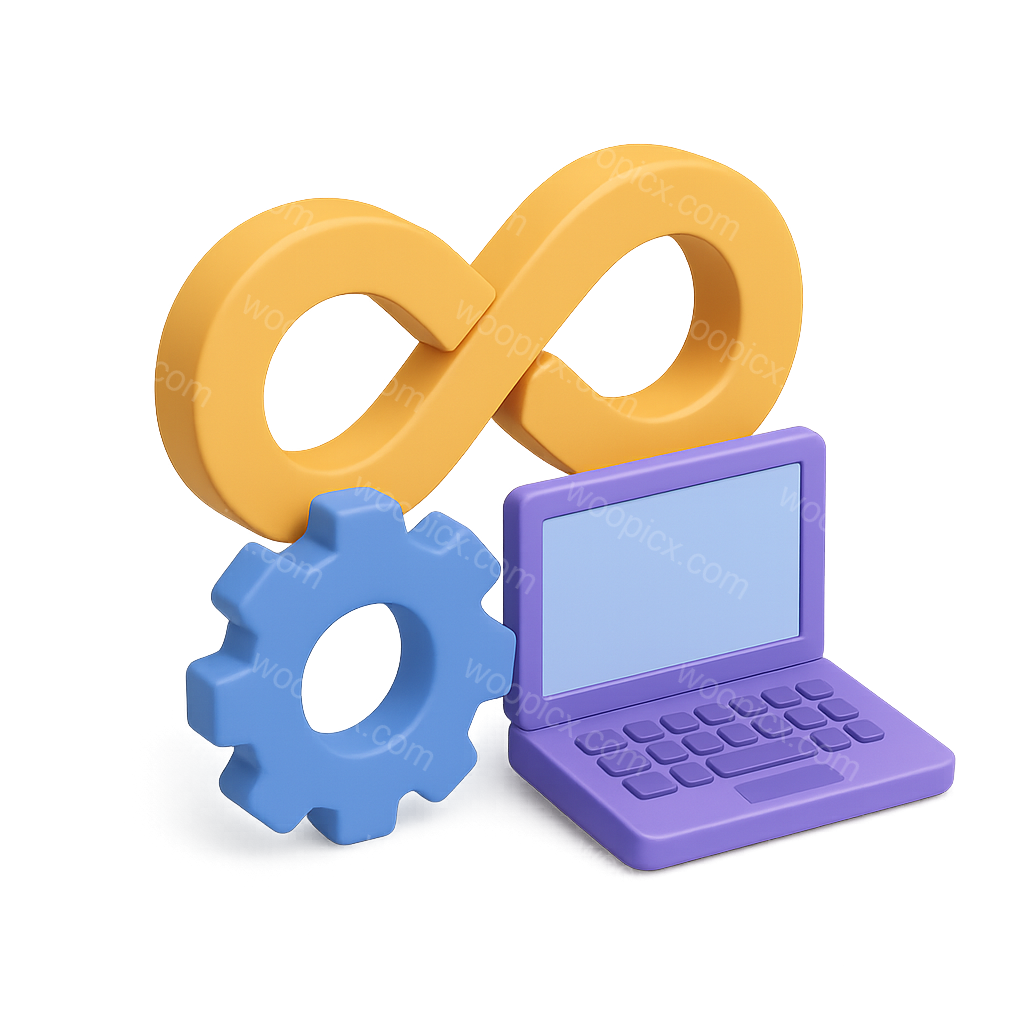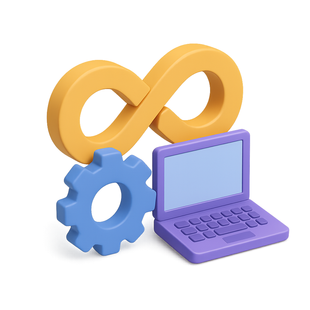 A vibrant 3D icon representing DevOps, featuring an infinity symbol, a gear, and a laptop. The design is isometric with a transparent background, showcasing a colorful and modern aesthetic.