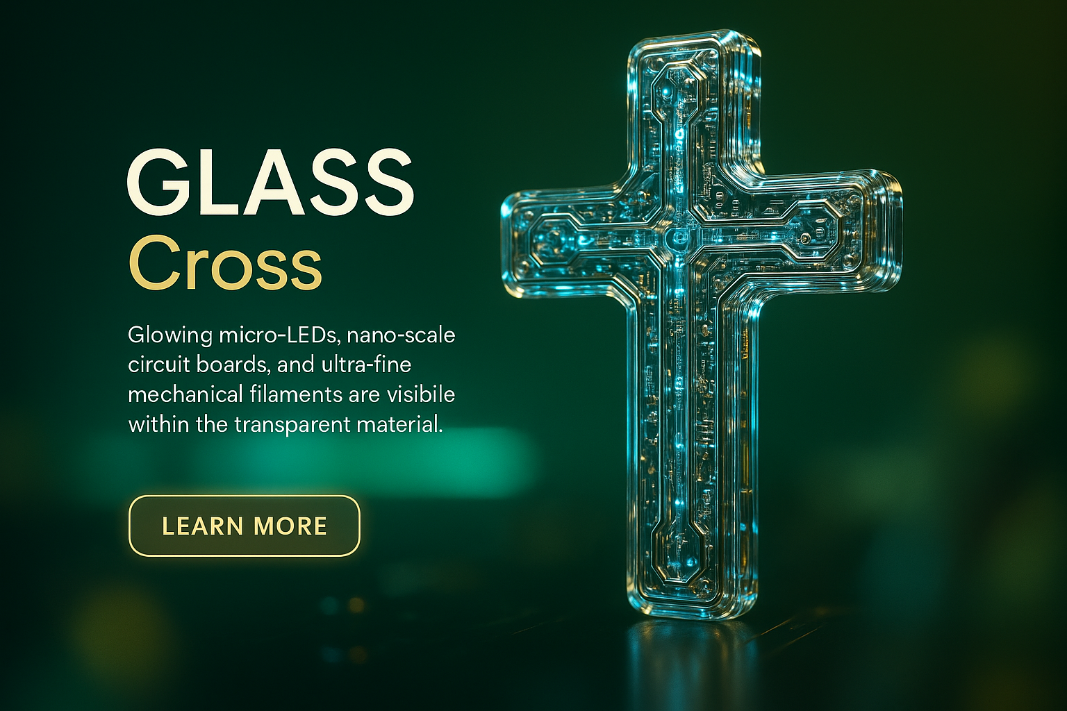/Collection: /by davooda/Type: PNG/A hyperrealistic glass cross featuring glowing micro-LEDs, intricate circuit boards, and metallic elements. Neon accents enhance its ethereal beauty, set against a softly blurred background.