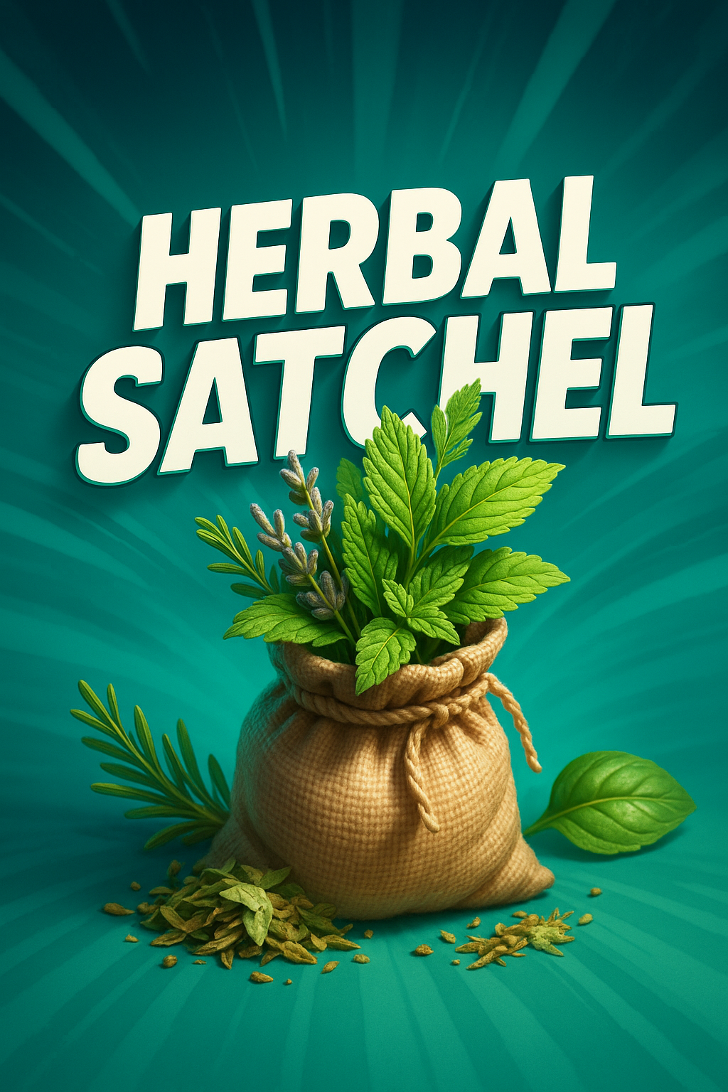 /Collection: /by davooda/Type: PNG/A vibrant illustration of a herbal satchel filled with fresh greenery, set against a dynamic gradient background. The bold title 'HERBAL SATCHEL' adds visual interest.