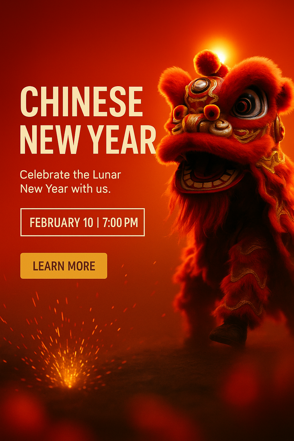 A promotional banner for Chinese New Year featuring a lion dance. The design is vibrant with festive colors and conveys a celebratory theme, ideal for event marketing.