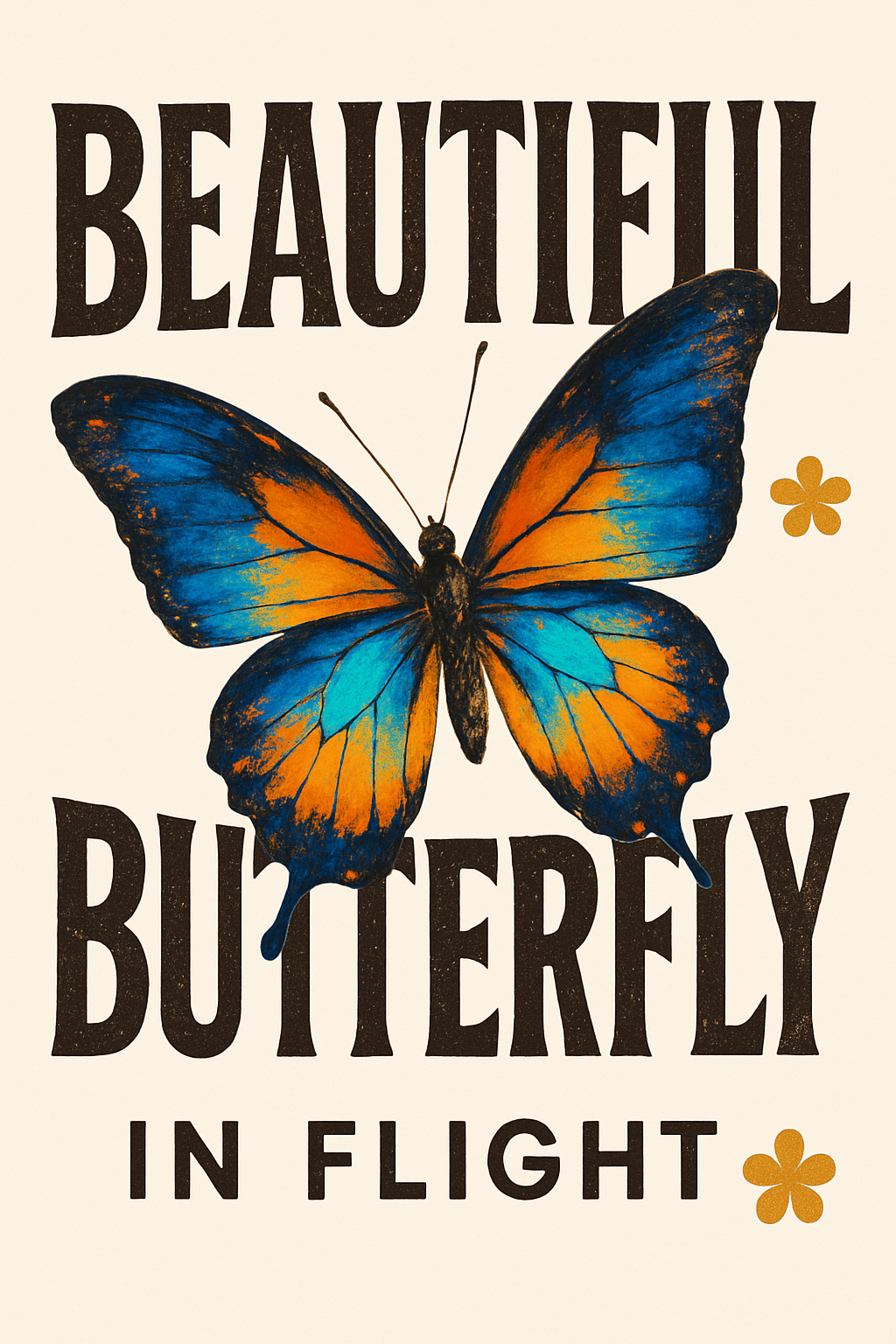 /Collection: /by davooda/Type: PNG/Vibrant artwork showcasing a beautiful butterfly in flight, featuring bold typography and a nostalgic design style. Ideal for nature-themed decor or educational materials.