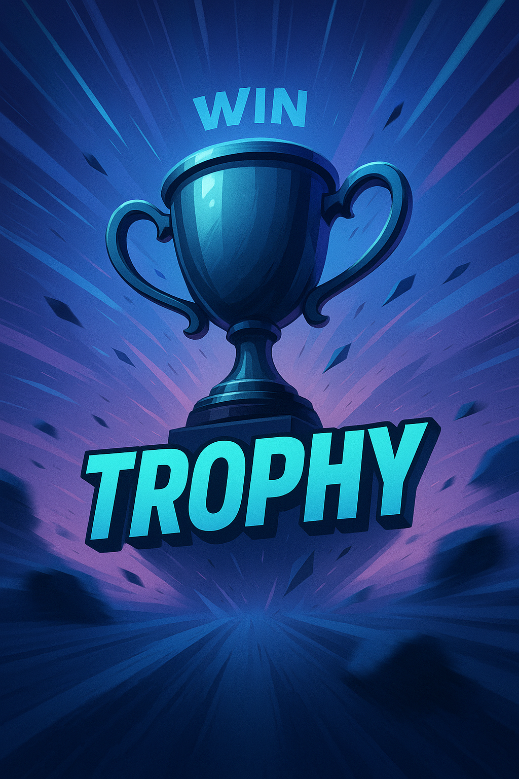 A vibrant trophy image featuring dynamic lines radiating from the center, emphasizing the word 'WIN' above the trophy. The background transitions smoothly with engaging colors, enhancing the sense of motion.