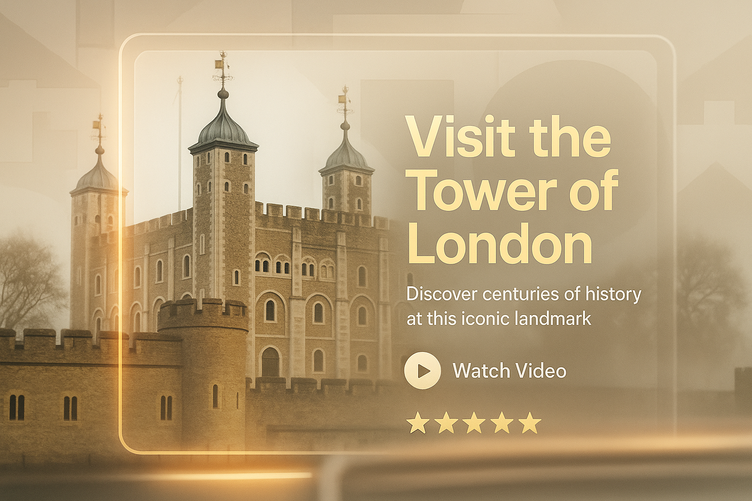 Engaging promotional image highlighting the Tower of London, featuring historical architecture and a call-to-action for video content. Ideal for tourism marketing.