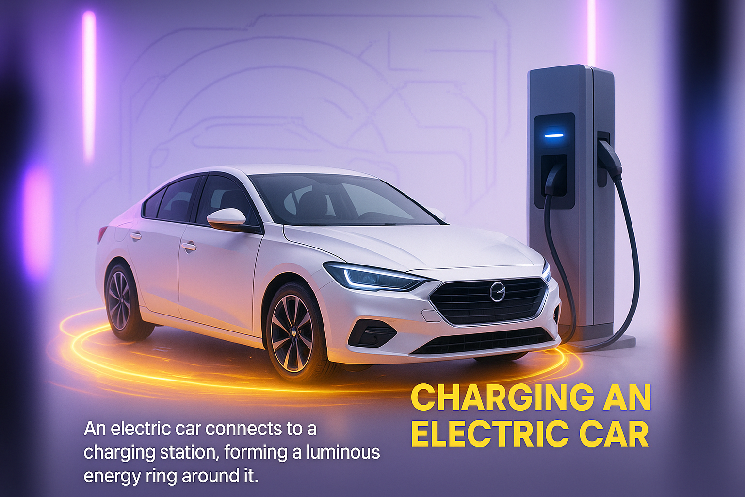 /Collection: /by davooda/Type: PNG/A visually striking digital illustration showcasing an electric car at a charging station, surrounded by a luminous energy ring, ideal for promoting electric vehicle technology.