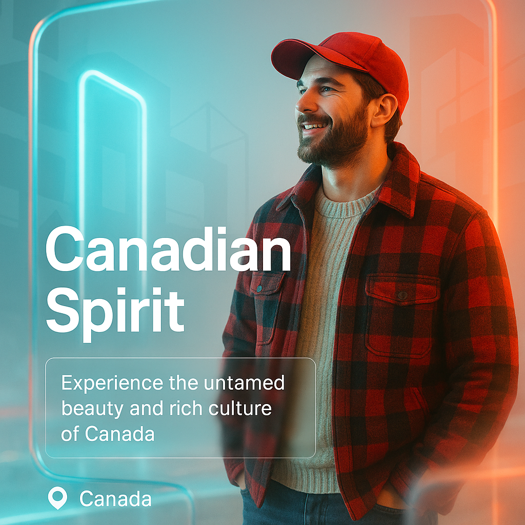 /Collection: /by davooda/Type: PNG/Engaging travel promotion graphic highlighting the beauty and culture of Canada, featuring a smiling individual in a stylish outfit with a modern design aesthetic.