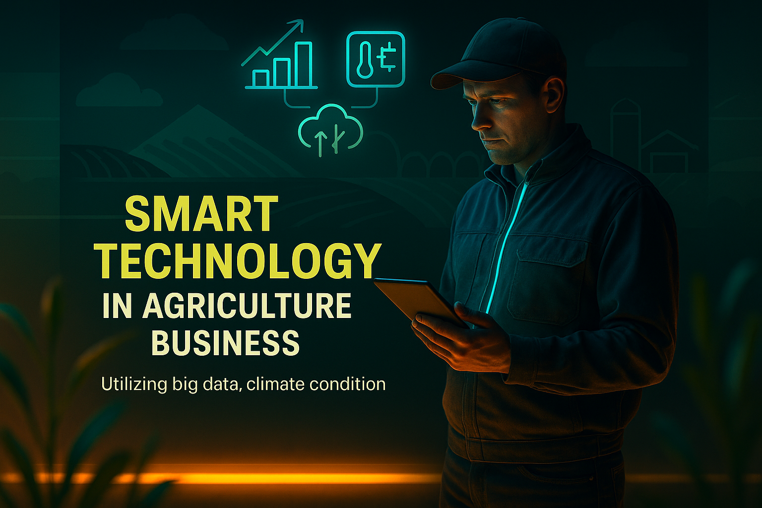 A visually engaging promotional graphic highlighting the use of smart technology in agriculture, featuring a person using a device amidst a modern backdrop, ideal for agritech marketing.