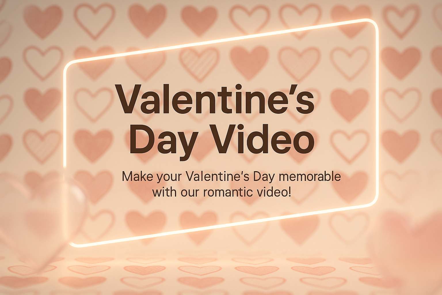 Inviting promotional graphic for a Valentine's Day video featuring soft heart motifs and warm lighting, perfect for couples looking to celebrate love.
