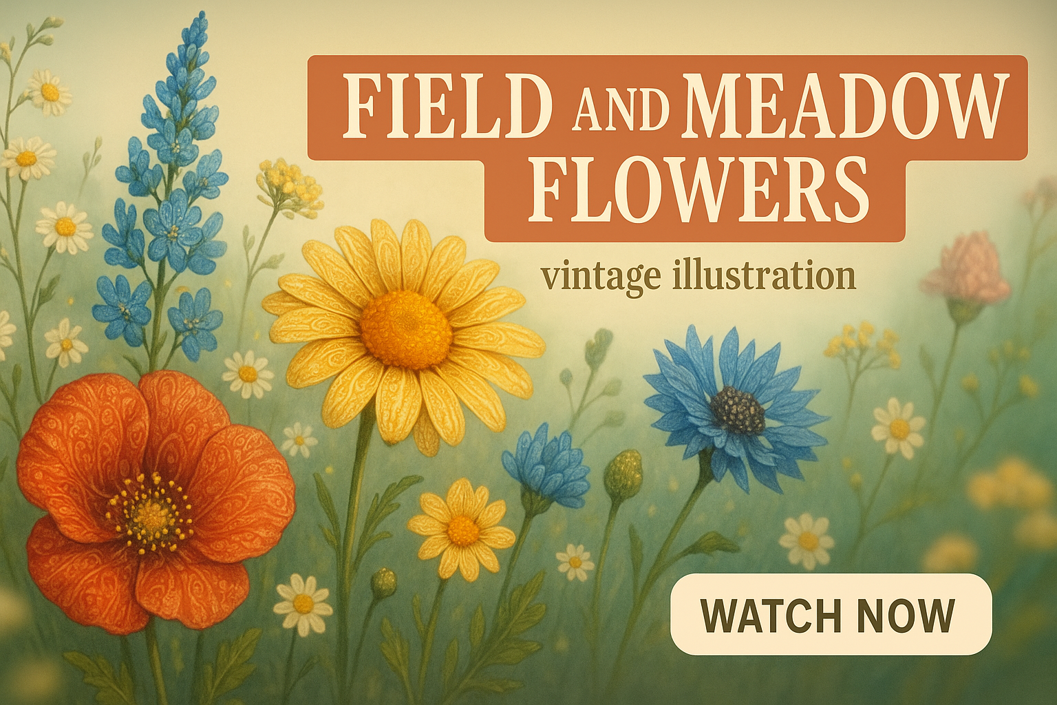 Charming vintage illustration showcasing a variety of field and meadow flowers with a warm color palette, ideal for nature-themed promotions or decor.