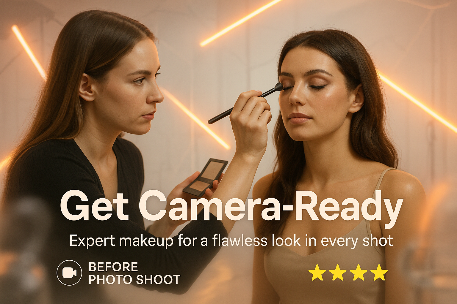 /Collection: /by davooda/Type: PNG/Engaging promotional image showcasing a makeup artist applying makeup for a photoshoot, featuring warm lighting and a modern aesthetic, ideal for beauty and photography marketing.