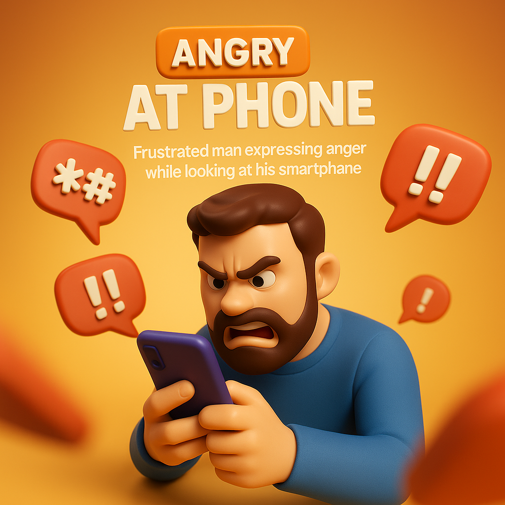 This 3D illustration features a man expressing frustration while looking at his smartphone, ideal for social media or digital marketing contexts.
