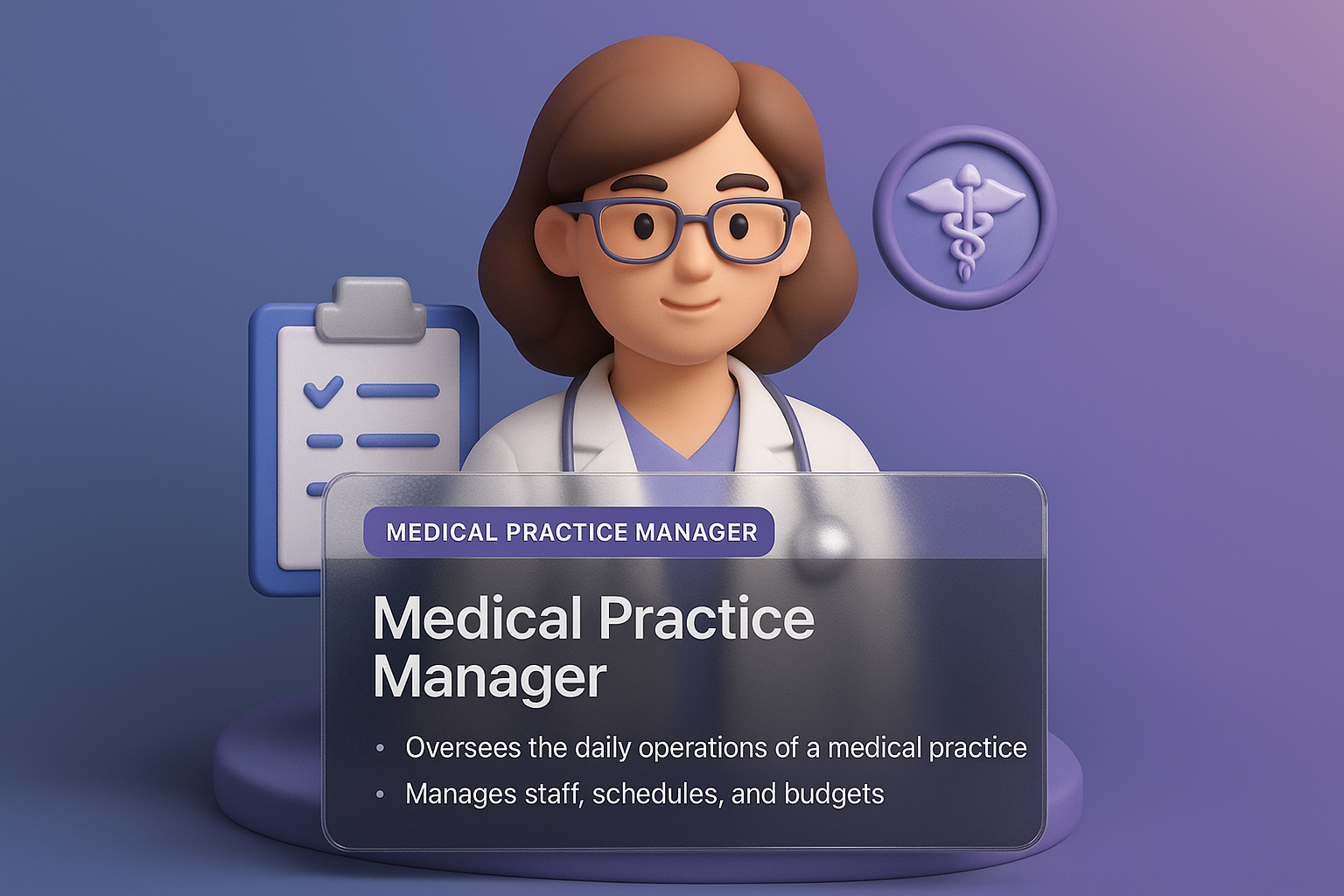 /Collection: /by davooda/Type: PNG/A vibrant 3D illustration featuring a Medical Practice Manager. The character is set against a smooth gradient background, with visual elements highlighting their role in managing medical operations.