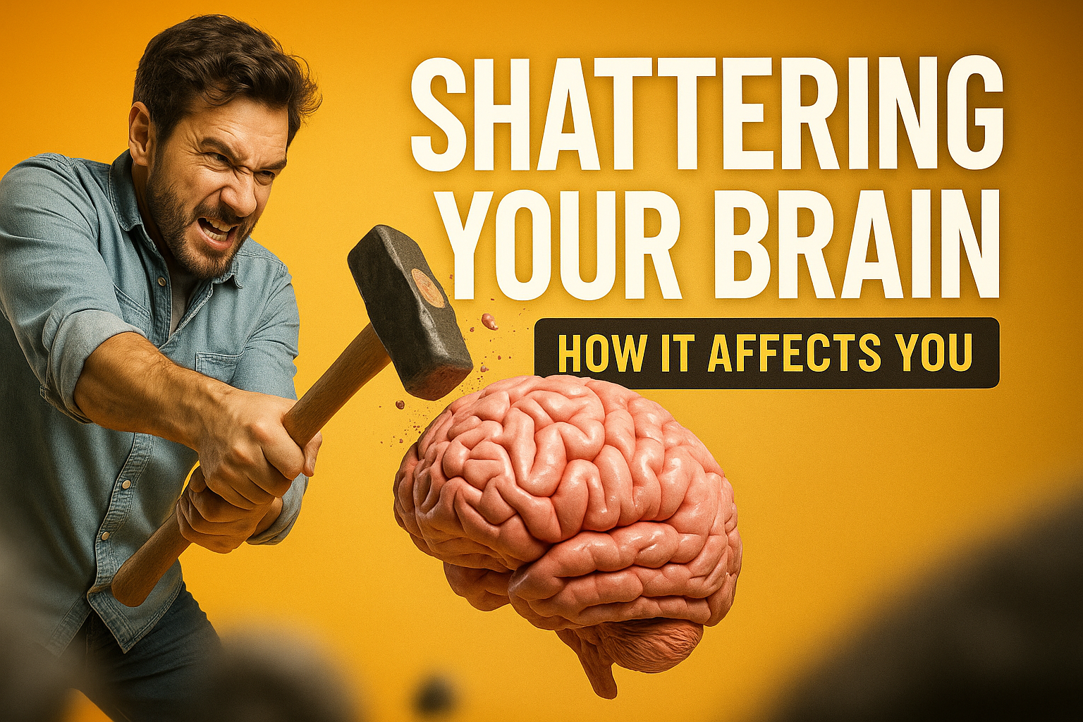 Striking graphic illustrating the concept of mental strain, featuring a man swinging a hammer at a brain. Ideal for educational content on mental health.