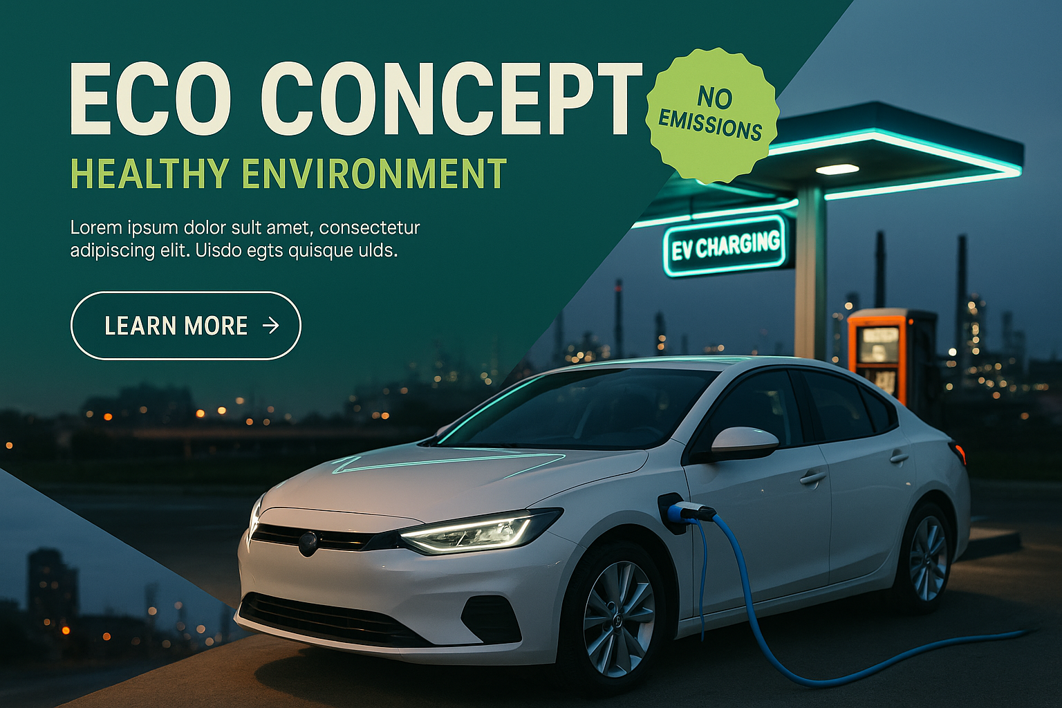 /Collection: /by davooda/Type: PNG/An electric car is charging at a city gas station, surrounded by an industrial landscape. The scene emphasizes eco-friendliness with neon accents and a focus on a healthy environment.