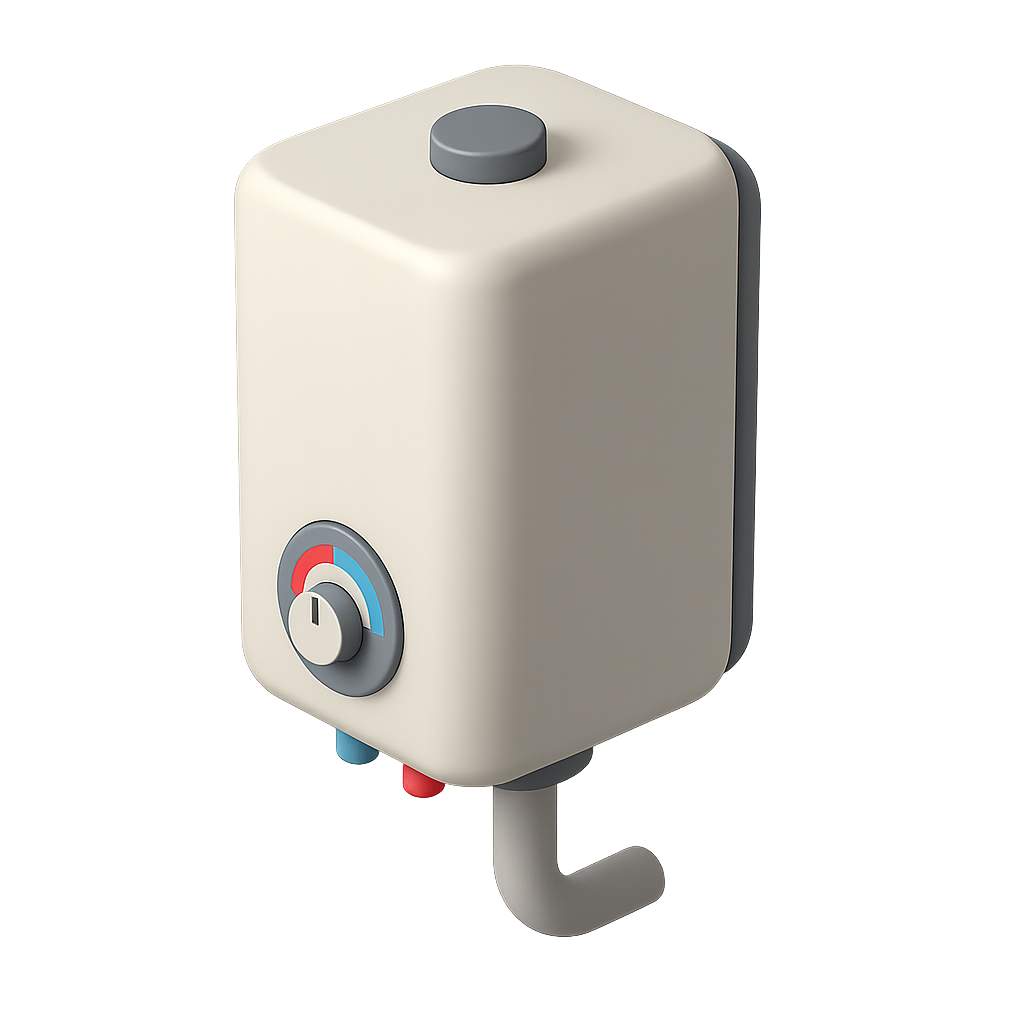 A modern 3D icon of a boiler featuring a cubic design with a three-quarter view. The icon showcases a control knob and colored indicators, all set against a subtle gradient background.