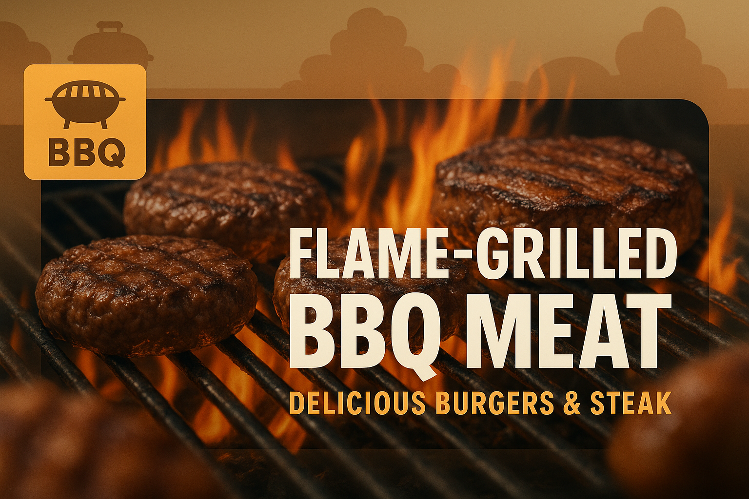 Promotional BBQ Meat Advertisement Featuring Grilled Burgers