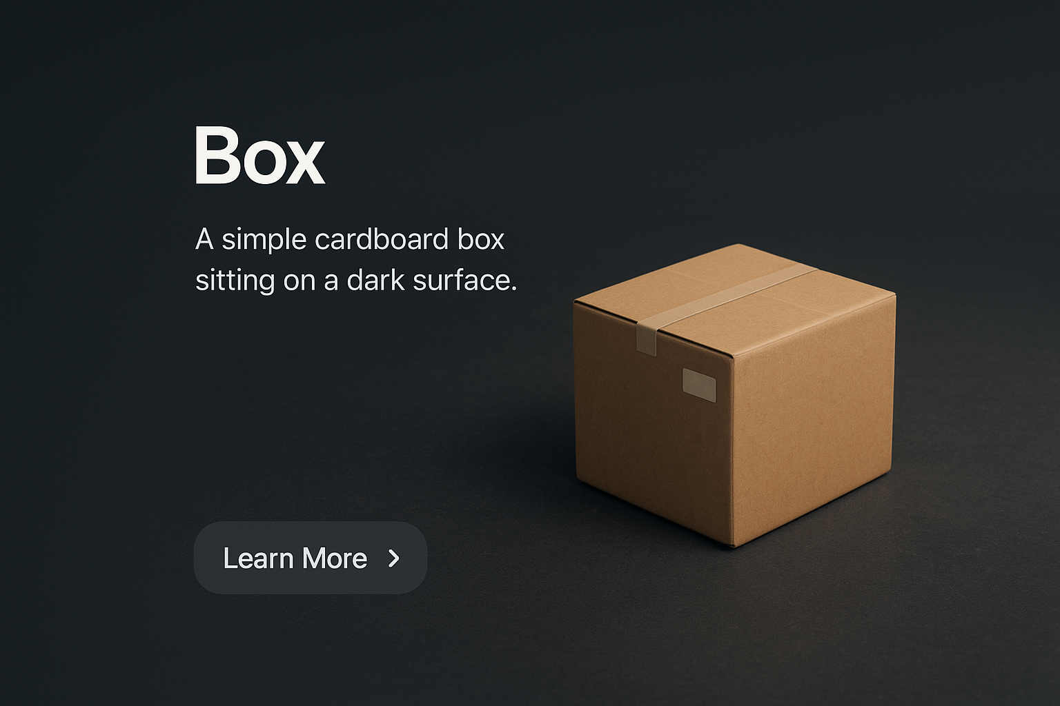 /Collection: /by davooda/Type: PNG/A realistic 3D scene featuring a simple cardboard box on a dark surface. The design includes a clear label and a call-to-action button, emphasizing a sleek, modern aesthetic.