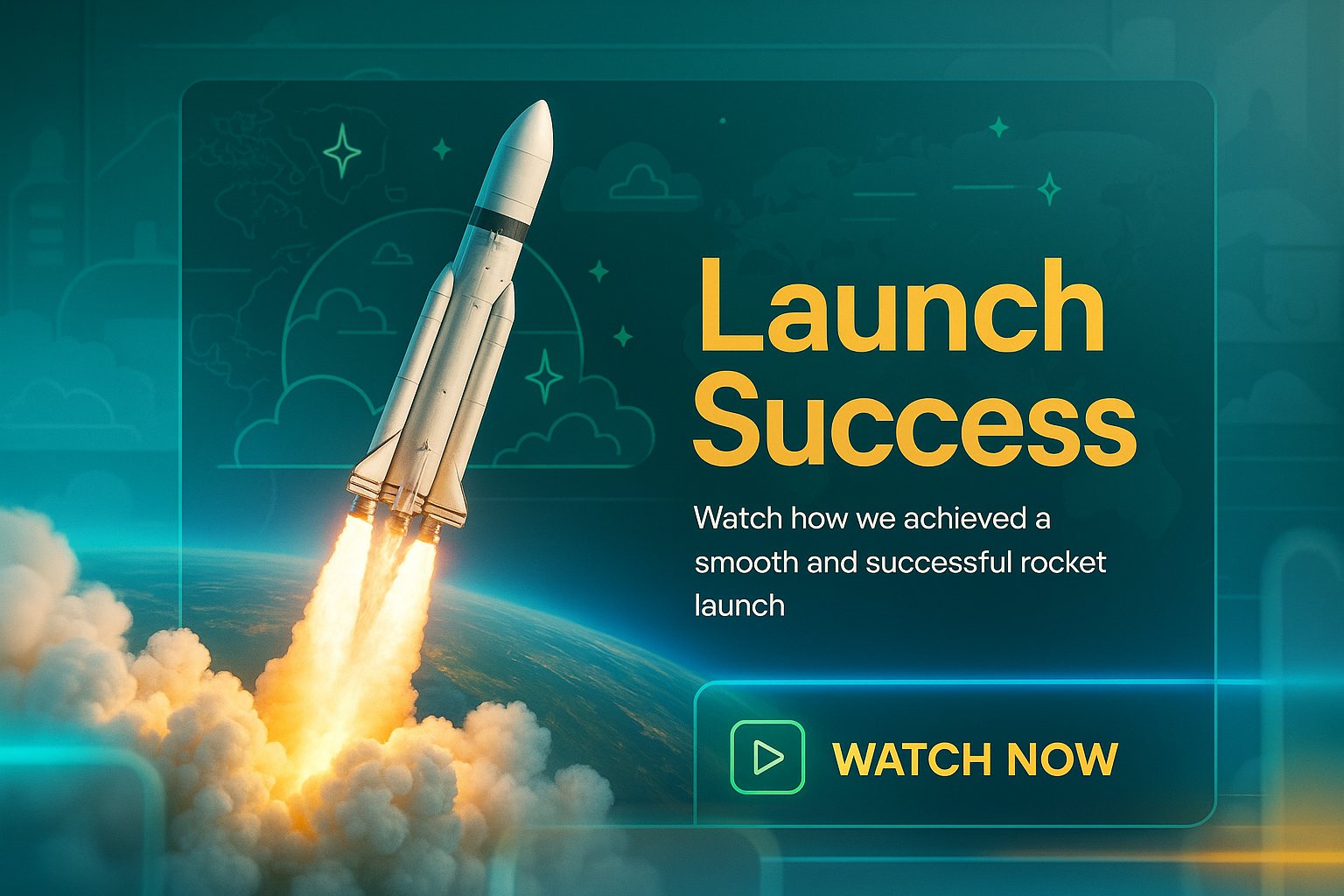 Vibrant promotional graphic showcasing a rocket launch, designed to attract viewers for a video. The modern style and bold typography emphasize success and achievement.