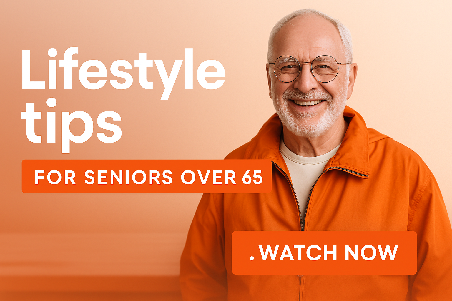 /Collection: /by davooda/Type: PNG/A smiling senior man wearing an orange jacket showcases lifestyle tips for seniors over 65. The clean, gradient background enhances the focus on him and the call-to-action.