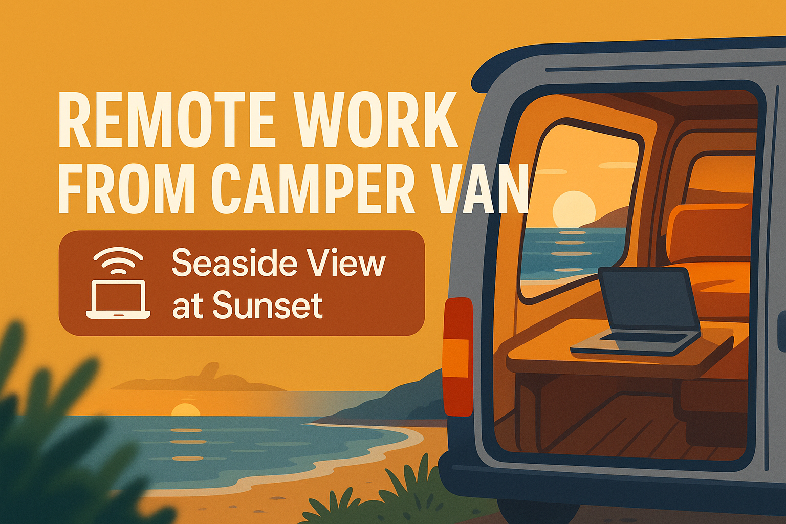 /Collection: /by davooda/Type: PNG/A vibrant illustration depicting remote work from a camper van with a seaside sunset view. Ideal for promoting the digital nomad lifestyle and remote work culture.