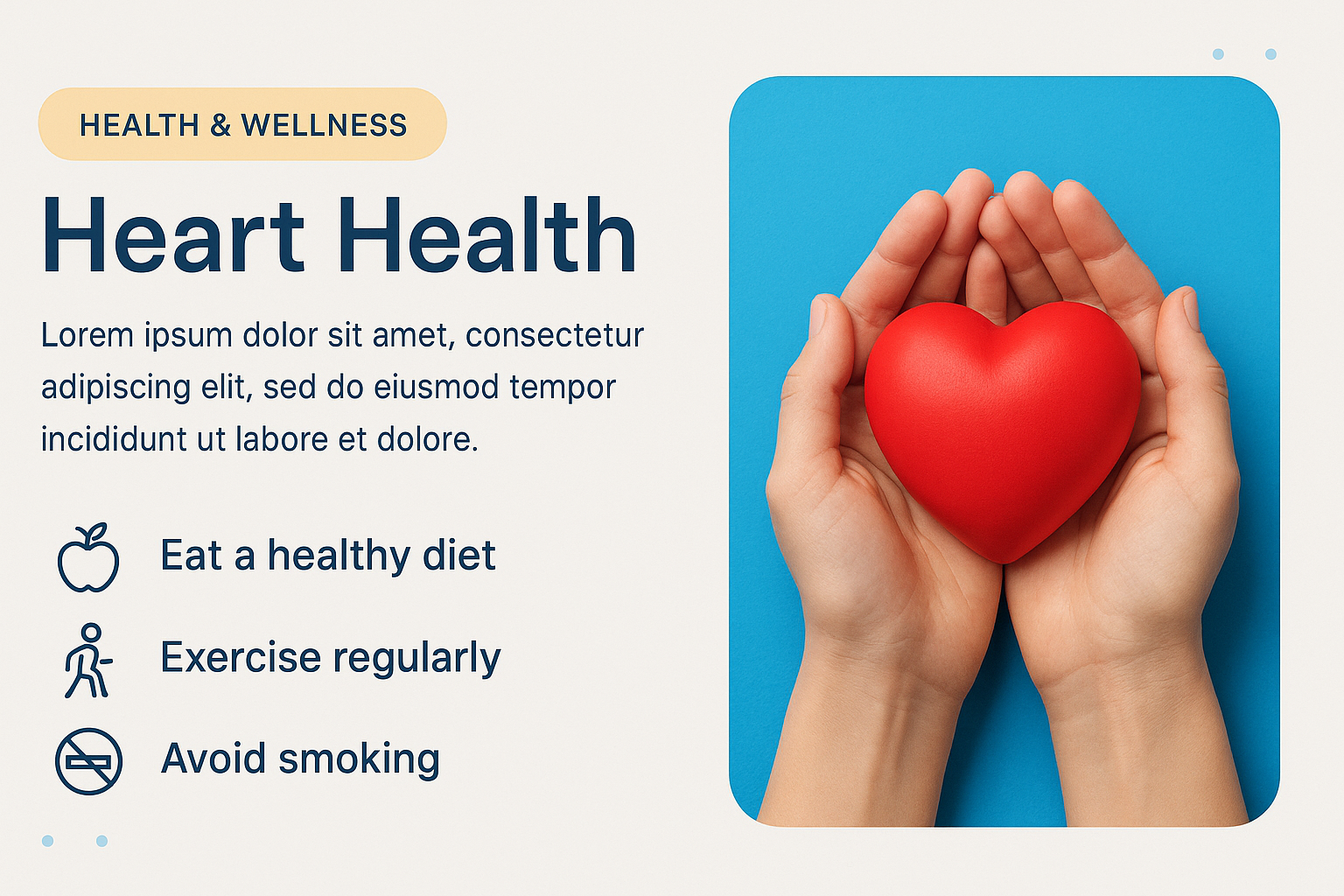 Informative health and wellness graphic featuring hands holding a heart, promoting heart health tips. Ideal for health campaigns and educational materials.