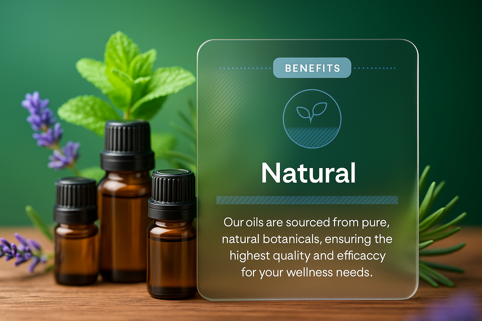 An appealing arrangement of essential oil bottles alongside fresh lavender and mint plants on a wooden surface, showcasing their natural origin and benefits.