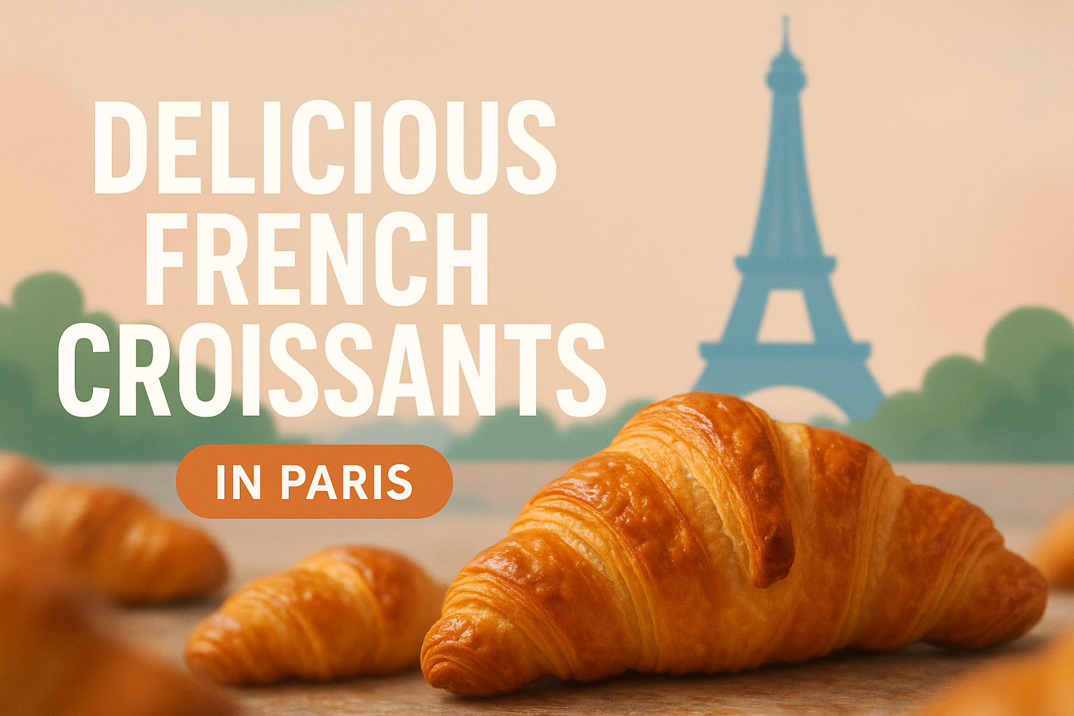/Collection: /by davooda/Type: PNG/A visually appealing image showcasing freshly baked French croissants in the foreground, with a soft-focus background featuring the Eiffel Tower, ideal for food blogs or culinary promotions.