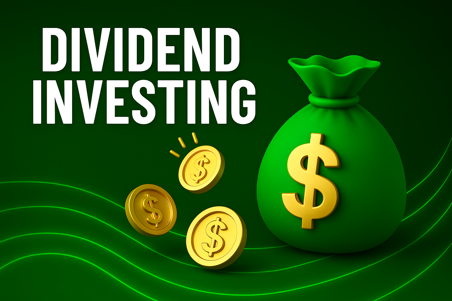 Vibrant 3D graphic depicting a money bag and coins, symbolizing dividend investing. Ideal for financial education and investment-themed content.