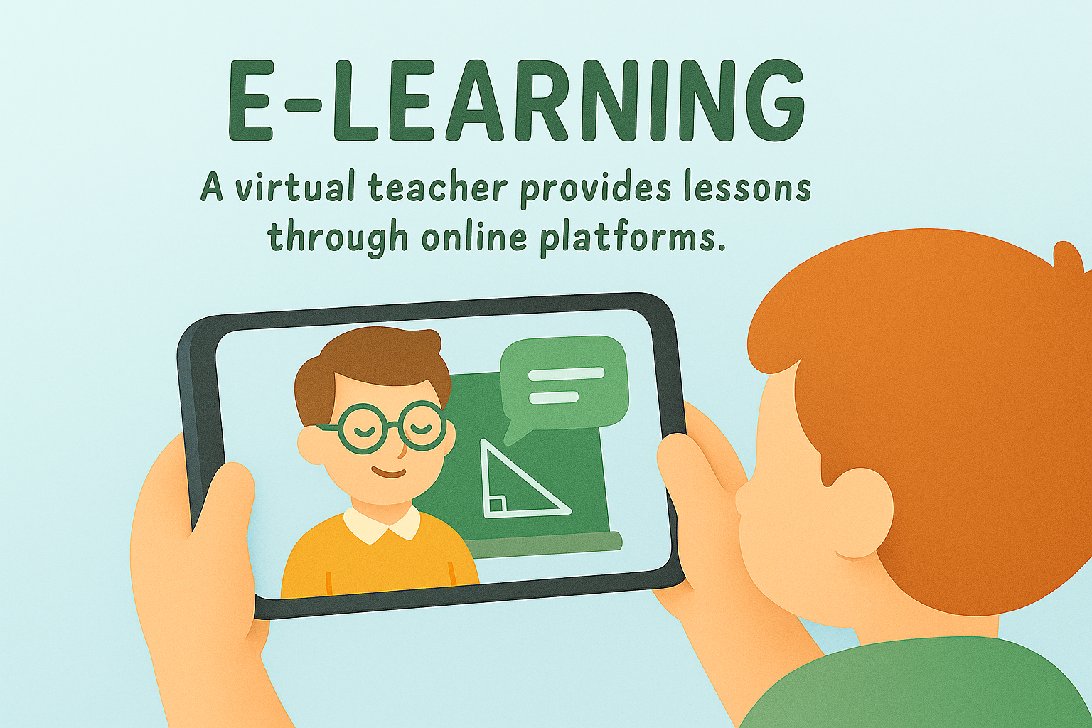 /Collection: /by davooda/Type: PNG/An engaging illustration depicting a child using a tablet for e-learning, featuring a virtual teacher. Ideal for educational content and online learning platforms.
