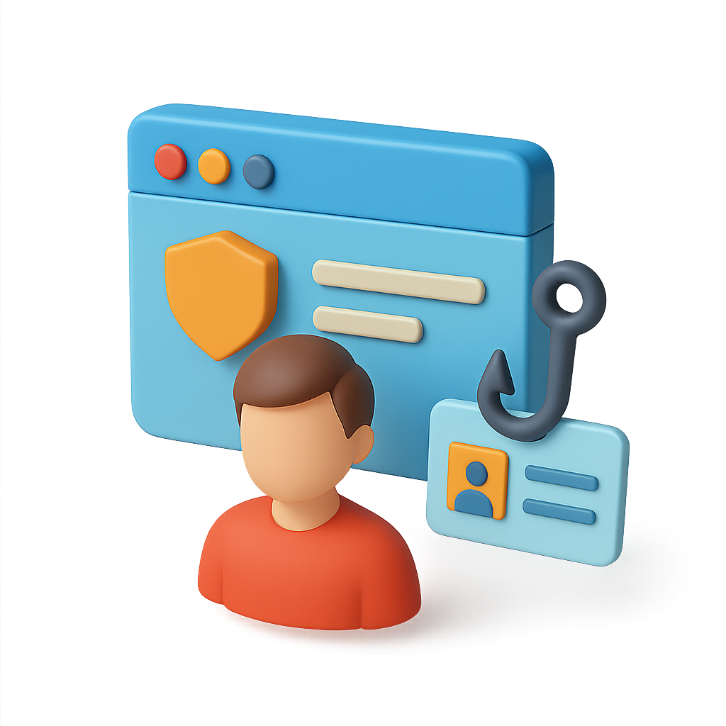 A colorful 3D icon illustrating social engineering themes. It features a user figure, a security shield, and a phishing hook with a user ID card against a blurred background.