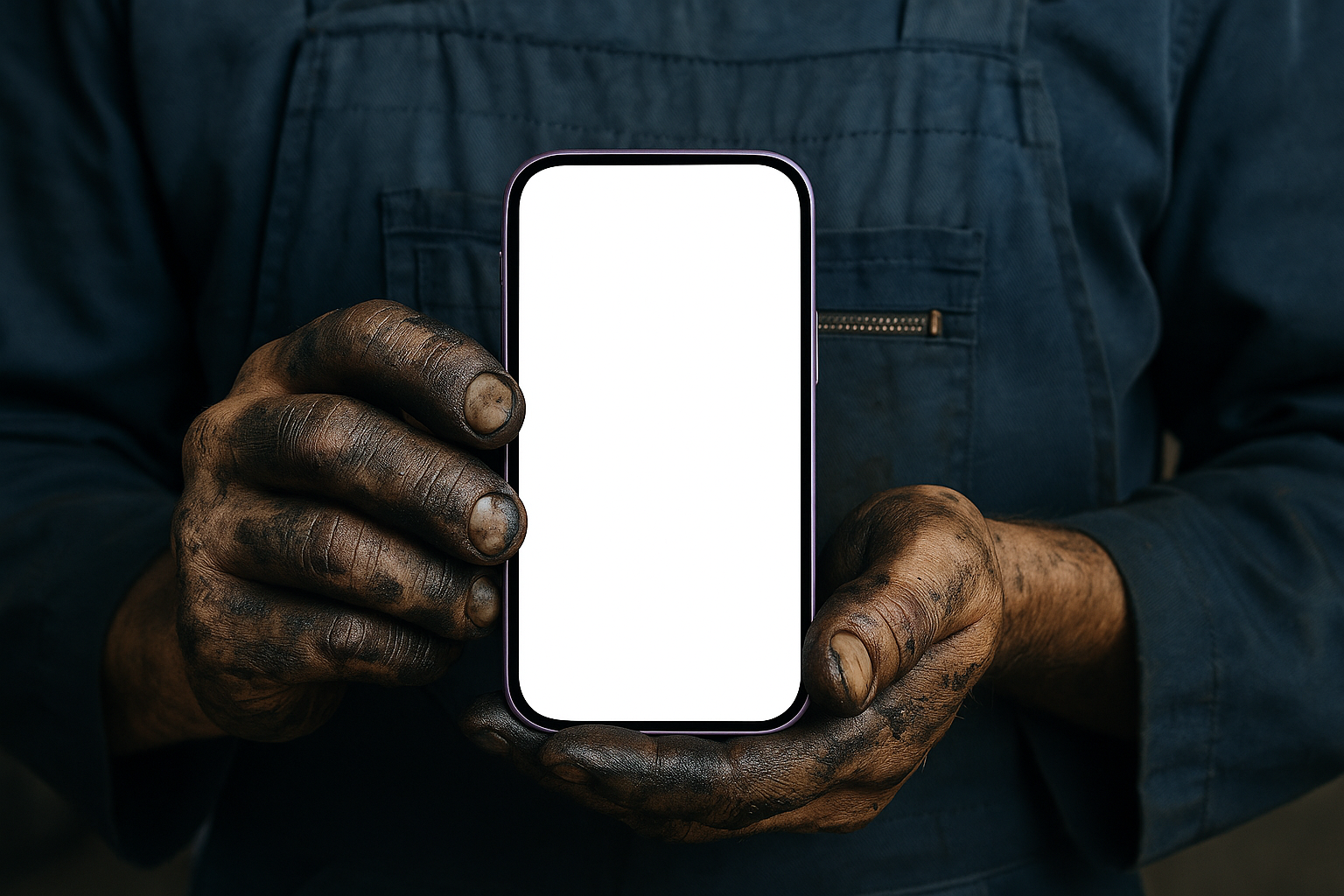 A male mechanic in a work uniform holds a purple phone with a white screen. His hands are covered in oil, showcasing his hard work and dedication.