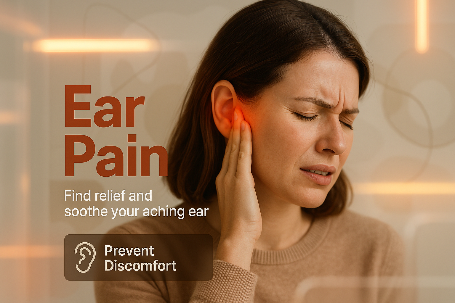 Informative health graphic highlighting ear pain relief strategies, featuring a distressed woman and warm color tones, ideal for medical blogs or health awareness campaigns.
