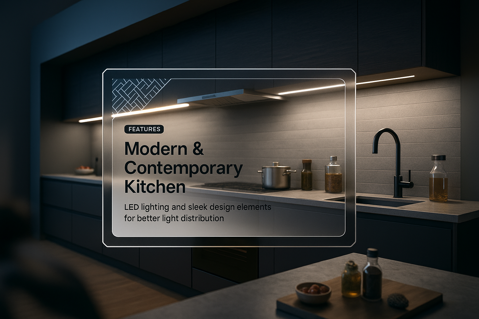 /Collection: /by davooda/Type: PNG/A contemporary kitchen featuring LED lighting and a sleek design. The layout includes a detailed feature block with a unique border integrated into the scene.