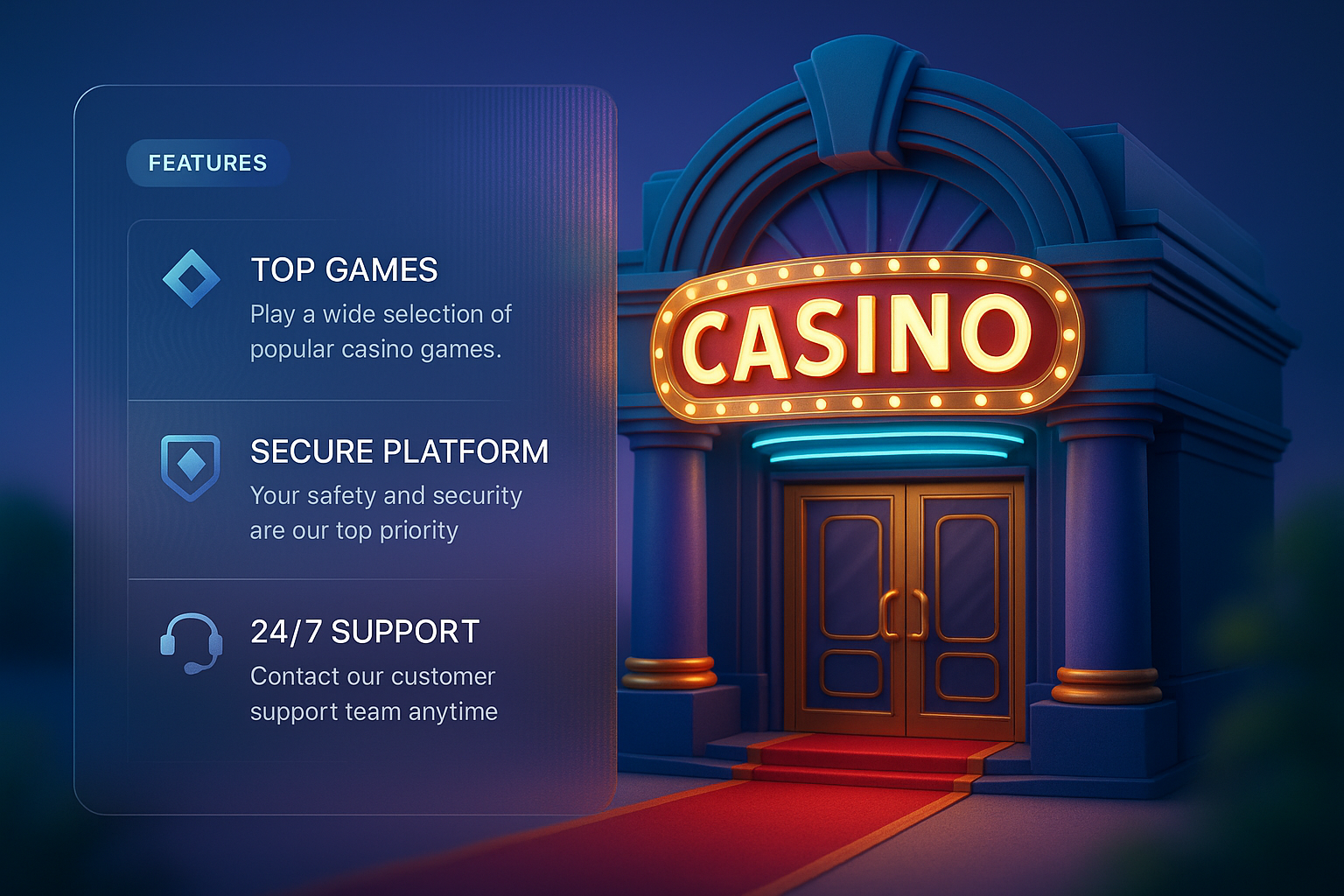 A captivating 3D illustration of a casino entrance featuring illuminated signage and highlighted features. A stylish display of gaming options and support.
