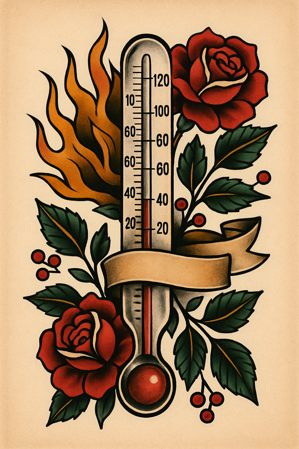/Collection: /by davooda/Type: PNG/A vintage-style illustration featuring a thermometer surrounded by roses and flames. Ideal for artistic or decorative purposes, appealing to lovers of retro aesthetics.