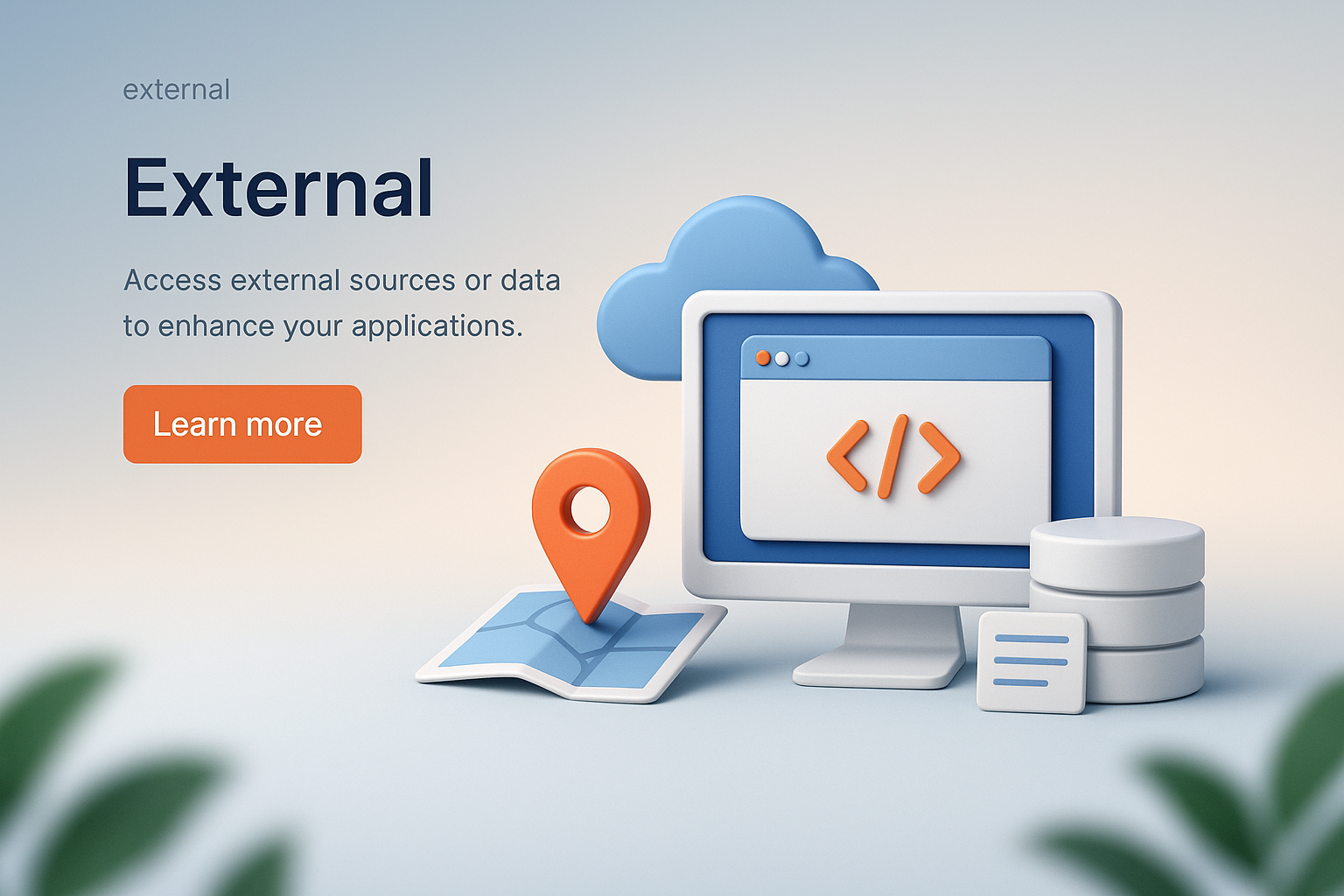A zoomed-out 3D illustration featuring a computer, cloud, and map pin. The design includes a gradient background and a call-to-action button, creating a cohesive visual experience.