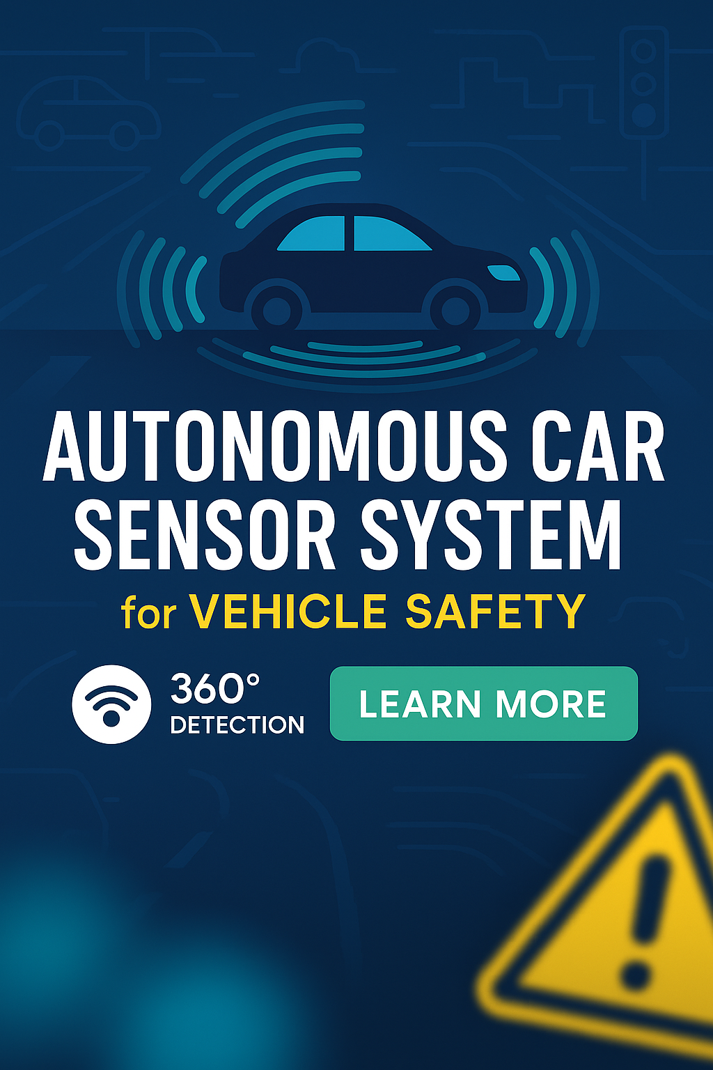 Engaging promotional graphic showcasing an autonomous car sensor system, emphasizing vehicle safety with modern design elements suitable for tech marketing.